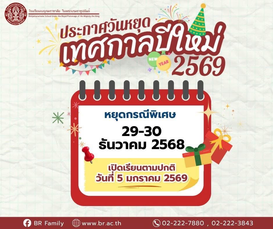 แจ้งหยุดเรียนกรณีพิเศษ ในจันทร์ที่ 29 และอังคารที่ 30 ธันวาคม พ.ศ.2568 เป็นเวลา 2 วัน