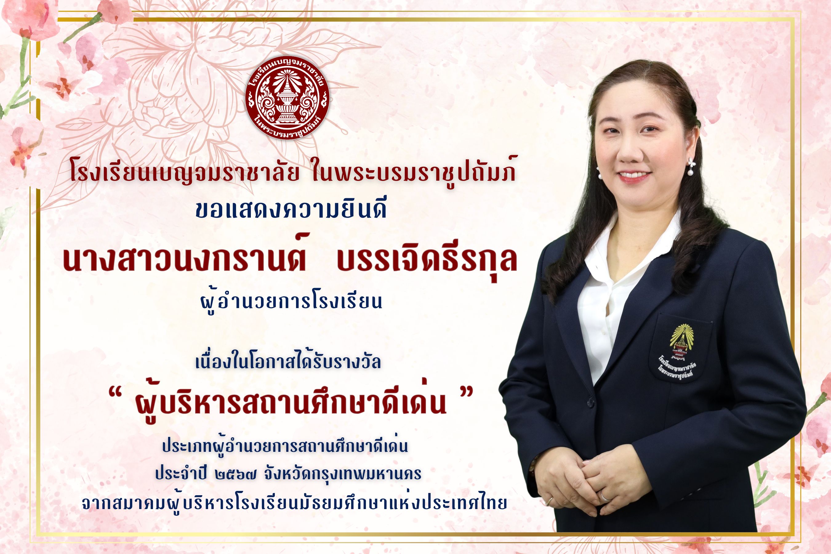 ขอแสดงความยินดีกับนางสาวนงกรานต์ บรรเจิดธีรกุล ผู้อำนวยการโรงเรียน เนื่องในโอกาสได้รับรางวัล ผู้บริหารสถานศึกษาดีเด่น ประจำปีการศึกษา 2567 จากสมาคมผู้บริหารโรงเรียนมัธยมศึกษาแห่งประเทศไทย