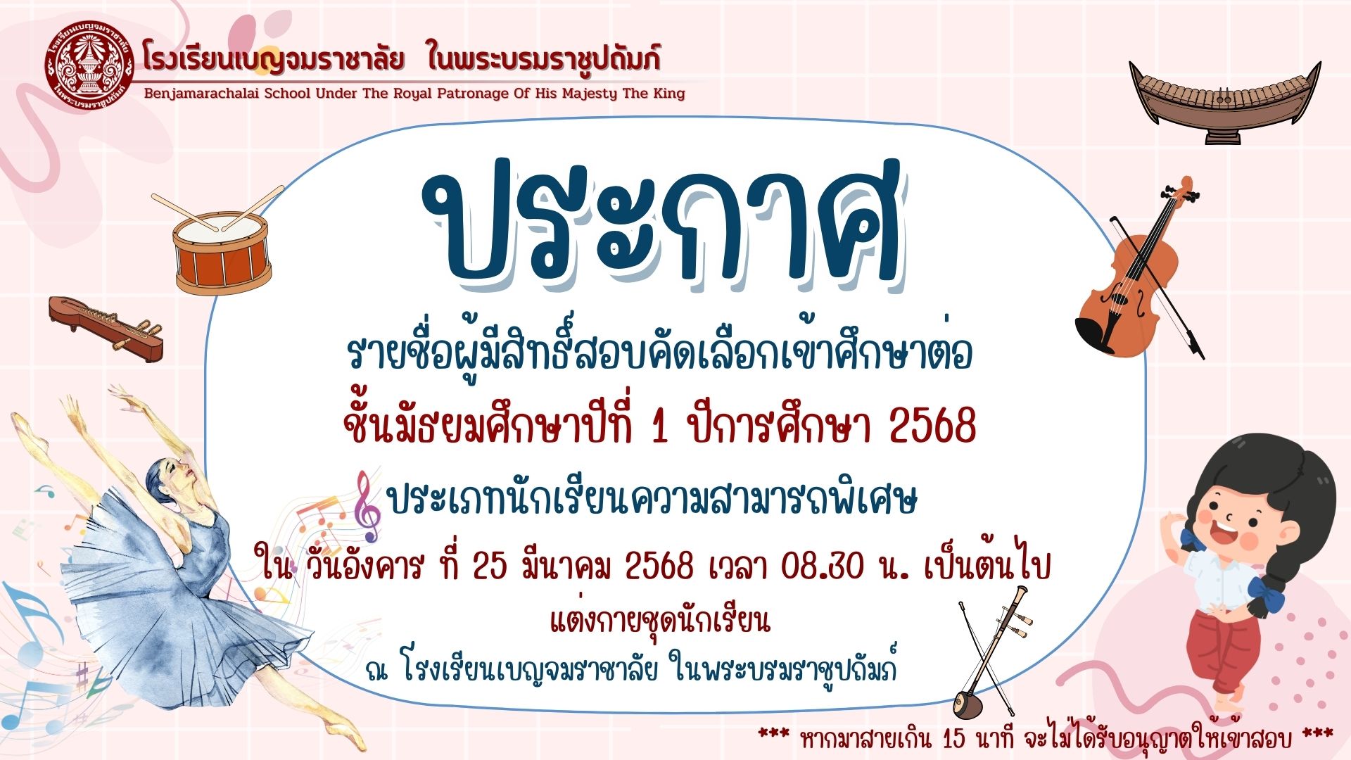 ประกาศรายชื่อผู้มีสิทธิ์สอบคัดเลือกเข้า ประเภทความสามารถพิเศษ ม.1
